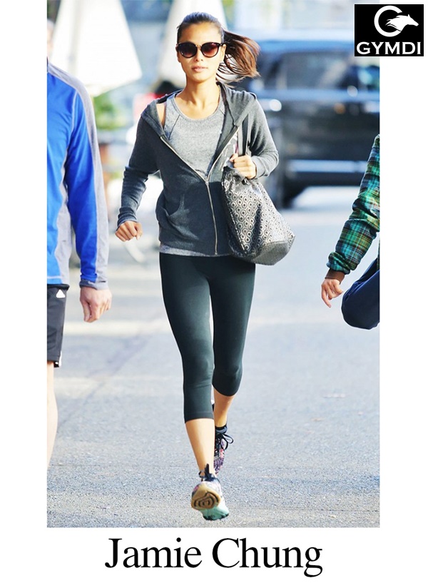 Jamie Chung năng động hơn với quần legging lửng kết hợp cùng áo ba lỗ màu xám. Cô cũng tự tin diện bộ trang phục này trên phố với chiếc áo khoác thể thao hờ hững.